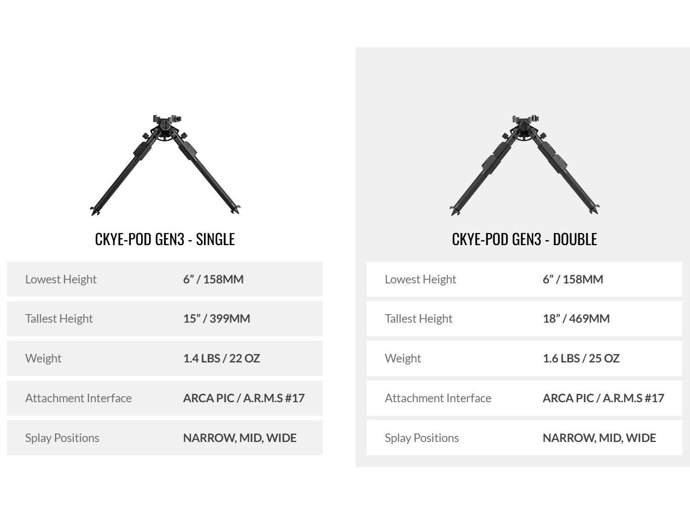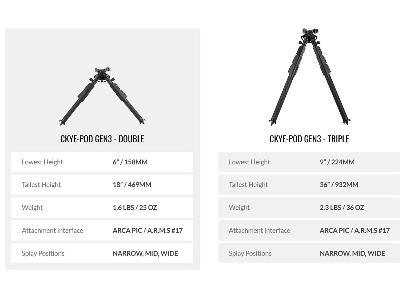 The CKYE-POD GEN3 Double-Pull is built for shooters who demand versatility, from flat range to mountain match. It’s the sweet spot between compact control and field height, giving you rock-solid performance across every barricade, slope, or rock pile. Fast to adjust, dead stable under recoil, and serviceable anywhere. This is the workhorse bipod for serious precision shooters.
