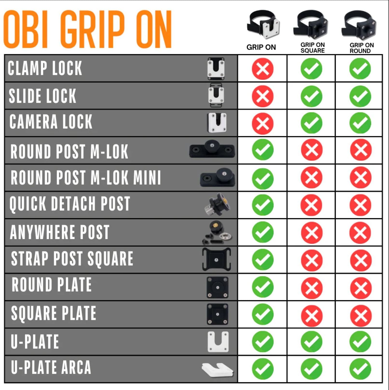 The Grip On family is OBi's most flexible product line. The Grip On comes standard with a U-Plate Arca, which mounts in any direction. The Grip On also comes with a 9-inch strap and will fit most binoculars, tripod legs, smaller cups/water bottles, and anything else you can find to attach. Attach the Grip On by loosening the strap until it fits around the gear, pull the strap snugly, and then tighten the Allen bolt to the desired tension.